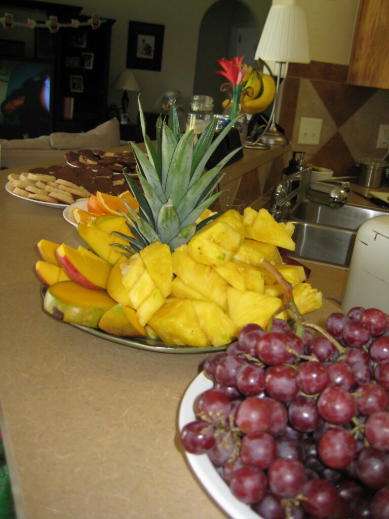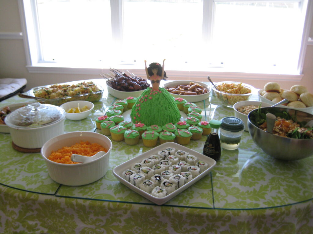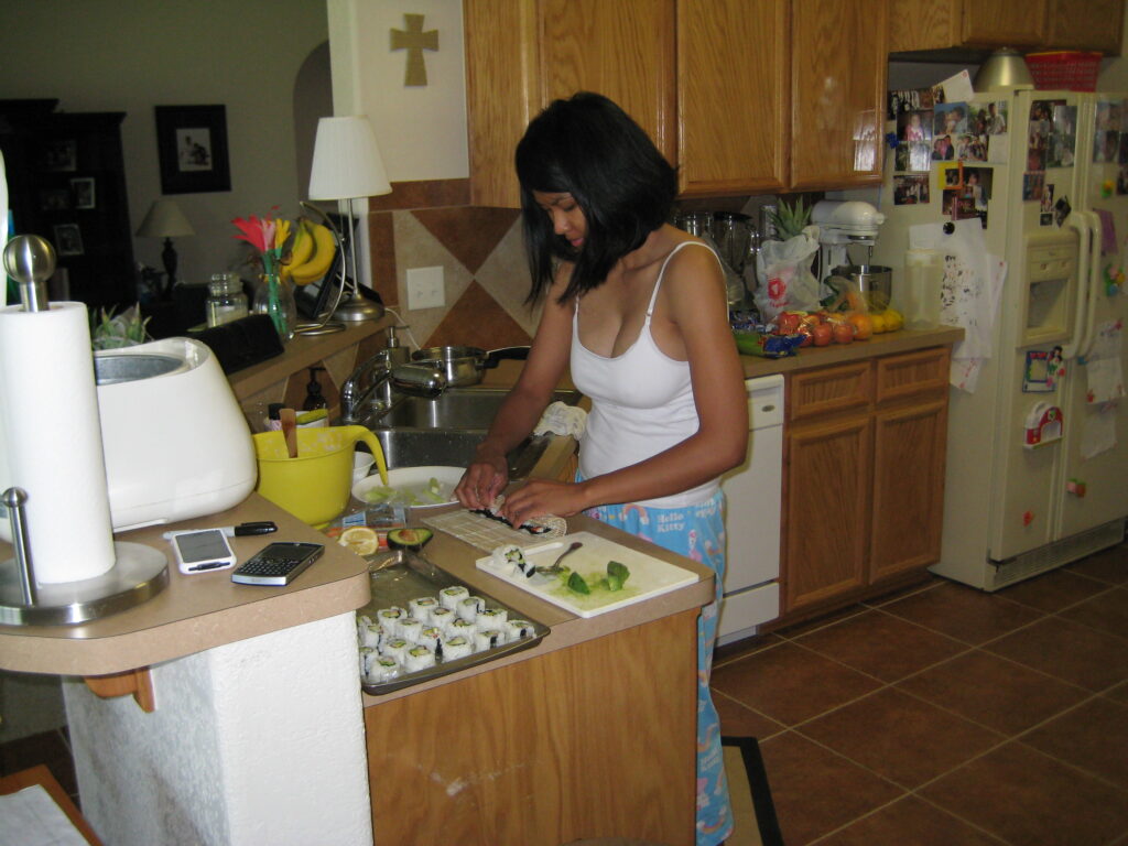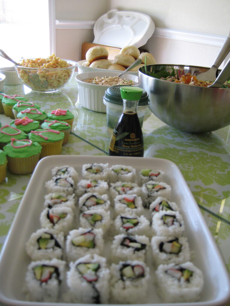 Day-o-fun. The first is a picture of me making my own sushi…my first time. The next are pictures of the food. On the menu: Pancit, Kalua Pork, Asian chicken wings, Red Rice, BBQ on a stick, California Rolls, Spinach Salad, Rolls, Chicken Keleguin, Macaroni Salad, Tempura Shrimp, Lumpia, and the desserts that I made yesterday. We played volleyball and ended the night with a little Wii and Scattergories. All in all the food was a big hit and everyone had a good time. Still have plenty of left overs…come by and help us finish them off.
