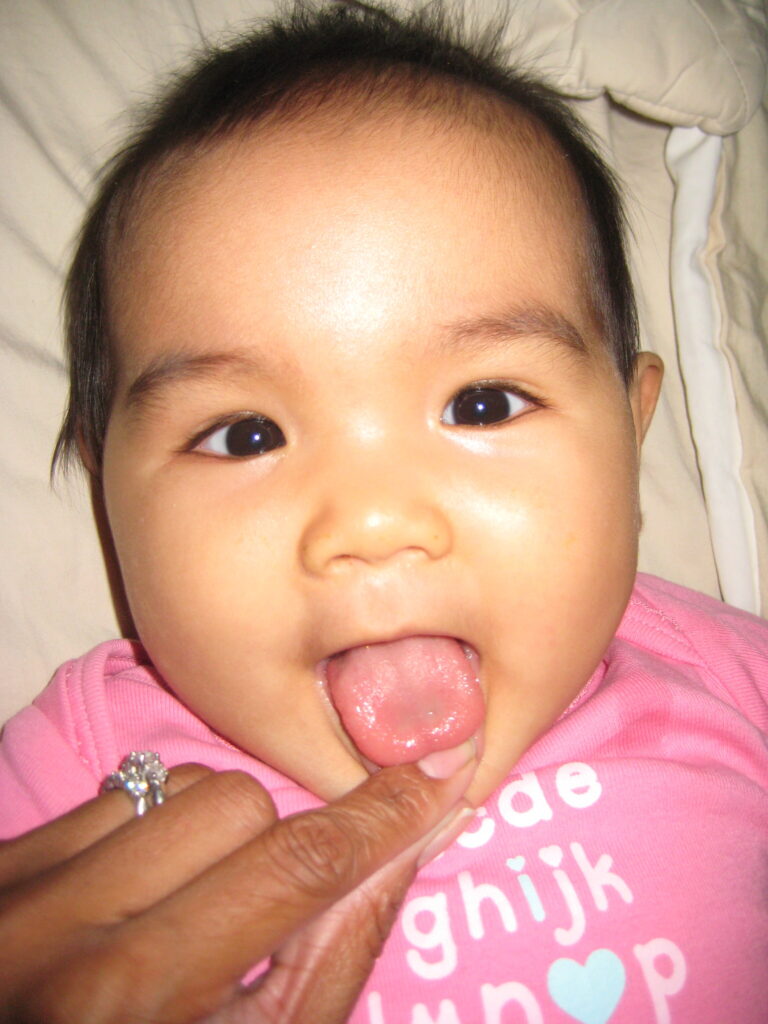 Milestone: Analise cut her first tooth yesterday. I only noticed it because she bit my finger as I tried to feed her. Although you really can’t see much yet, I tried to take a picture. She wasn’t cooperating and blocked the shot with her tongue. Let’s just hope my finger’s the only thing she’s going to bite… otherwise I don’t know how long this breast feeding business is going to last. Ouch.