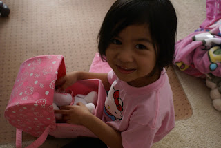 The weekend before her actual birthday, we went to the Hello Kitty store (Sanrio) and she was able to pick out some stuff. There was one thing in particular that she really wanted, a Hello Kitty baby with stroller. I was able to buy it without her seeing. I wrapped it up and bought some balloons to go along with it. On the morning of the 21st Anthony called to wish her happy birthday and let her know she had a special surprise at the front door.