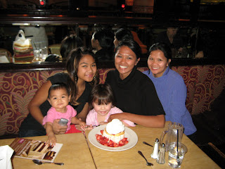 We helped my aunt with some pre-wedding stuff today and she treated us to lunch at the Cheesecake Factory where we stuffed ourselves silly. I loved our strawberry shortcake dessert. (In the picture: Ana, Sister Aprille, Cousin Tia, me, and Aunt Sharon)