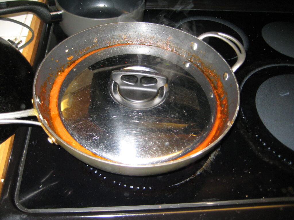 Yes Michael did put a cover on, but it’s not nearly big enough and is just sitting on top of the sauce.