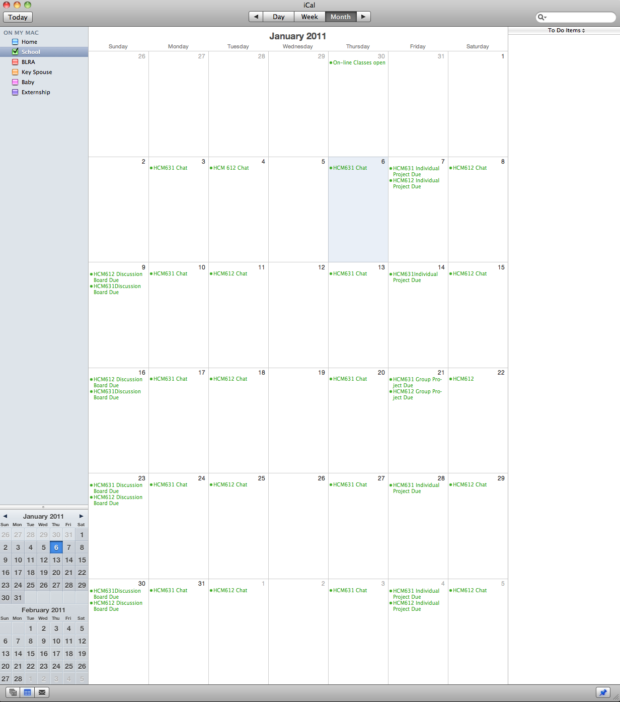 Last assignments due on 2/6/11. With HW and working at the hospital 3 days a week, I may be MIA for a while. Wish me luck. Get er done!
