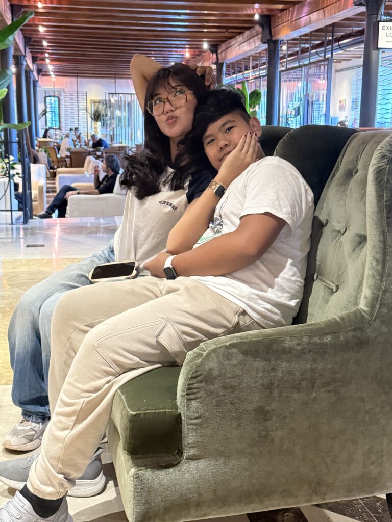 Hanging in the hotel lobby before heading out for a late lunch.